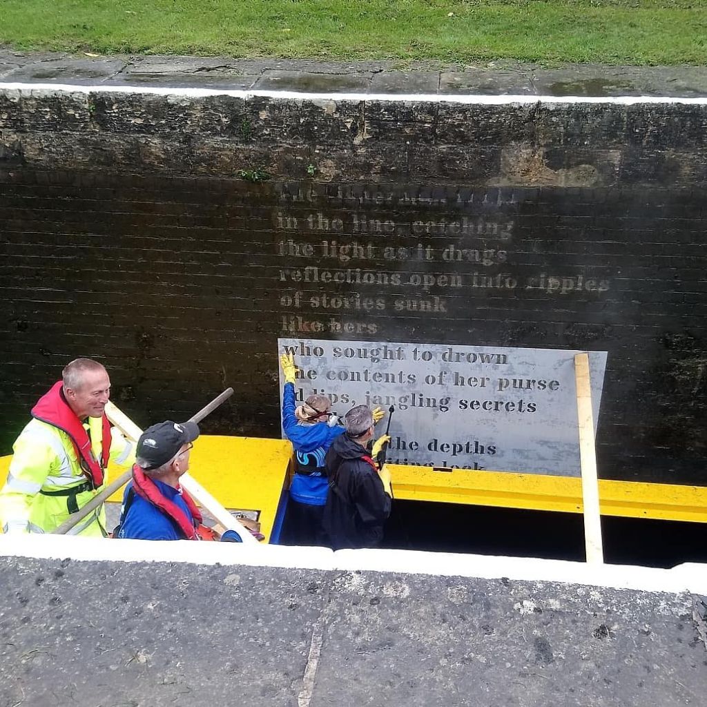Bath Top Lock Poem is a โtransformingโ poem, designed to be hidden under the upper waterline of the lock until it is emptied. The poem is then revealed line by line, and with each additional line, the poem takes on new meaning. This poem was installed in Bath Top Lock (13) in September 2018, as a pilot for a more extensive route. The poem was pressure-washed through a stencil onto the wall of the lock chamber โ a process that is both natural and environmentally friendly, lifting away a layer of dirt to leave an imprint of the letters on the brick.